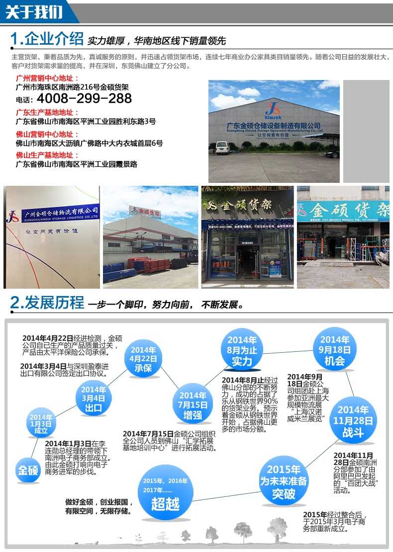 金碩前期為中國(guó)企業(yè)的物流系統(tǒng)和工業(yè)設(shè)備做集成配套服務(wù);2009年公司改組后定位為:專業(yè)的物流設(shè)備研發(fā)、設(shè)計(jì)、生產(chǎn)、銷售、服務(wù)等等一系列的綜合性企業(yè)。為滿足市場(chǎng)需求及提供更優(yōu)質(zhì)的產(chǎn)品服務(wù),2012年10月斥資500萬(wàn)元人民幣在佛山南海平洲三山南橋建立佛山生產(chǎn)基地,產(chǎn)品定位于輕、中、重型貨架、鋼制閣樓、橫梁式貨架為主的定制貨架生產(chǎn)專線;2015年8月為再次滿足市場(chǎng)需求金碩再次投入資金 ¥ 2000萬(wàn)元在佛山南海平洲工業(yè)園勝利東路3號(hào)建立了廣東生產(chǎn)基地。產(chǎn)品定位于標(biāo)準(zhǔn)件:輕型、中型貨架;公司資金實(shí)力雄厚,從國(guó)外引進(jìn)先進(jìn)的技術(shù)設(shè)備,質(zhì)量上嚴(yán)格按照ISO9001的體系標(biāo)準(zhǔn)執(zhí)行,并擁有一批年輕富有創(chuàng)造力的設(shè)計(jì)研發(fā)管理團(tuán)隊(duì),為金碩貨架的騰飛奠定了堅(jiān)實(shí)的基礎(chǔ)。