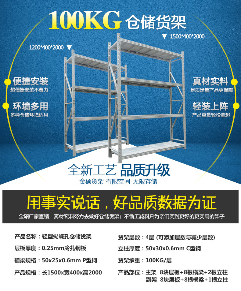 ![]() < > | 蝴蝶孔輕型貨架 白型號:蝴蝶孔輕型貨架01 規(guī)格:長150cmx寬40cmx高200cm 貨架層數(shù):4層(可增加層數(shù)) 貨架承重:100KG/層 立柱厚度:50*25*0.58MM 橫梁規(guī)格:50*25*0.48MM 層板厚度:0.25mm冷軋鋼板 訂購熱線:189-2509-6199 |