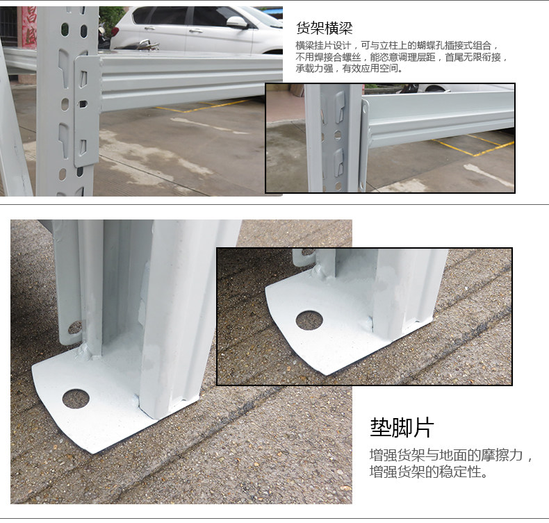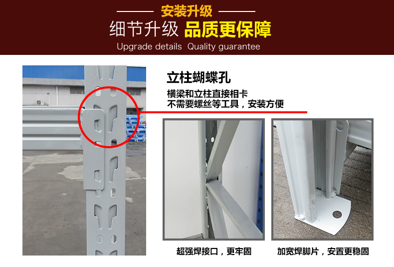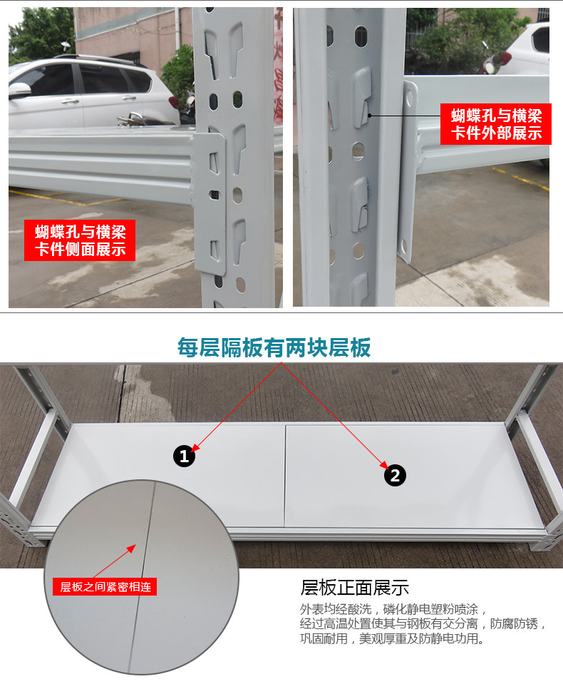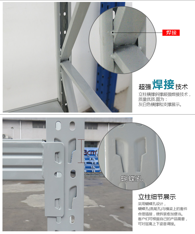 蝴蝶孔貨架是以蝴蝶孔結(jié)構(gòu)鎖緊,具有安裝方便,無需強力,放上貨物所產(chǎn)生壓力自然固定的特點,以55MM節(jié)距調(diào)節(jié)層高,主、輔架無限連接,可增加貨架的牢固度,節(jié)省投入。連桿采用P型管,增加了貨架的牢固性和安全性。