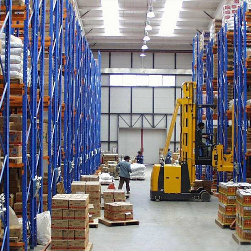 由于其存儲密度大,對地面空間利用率較高,常用在冷庫等存儲空間成本較高的地方。通廊式貨架非常適合那些貨品種類少但儲藏量大的倉儲應用。叉車可自由的進出于貨架之間的走廊從而使倉庫得到最大限度的利用。