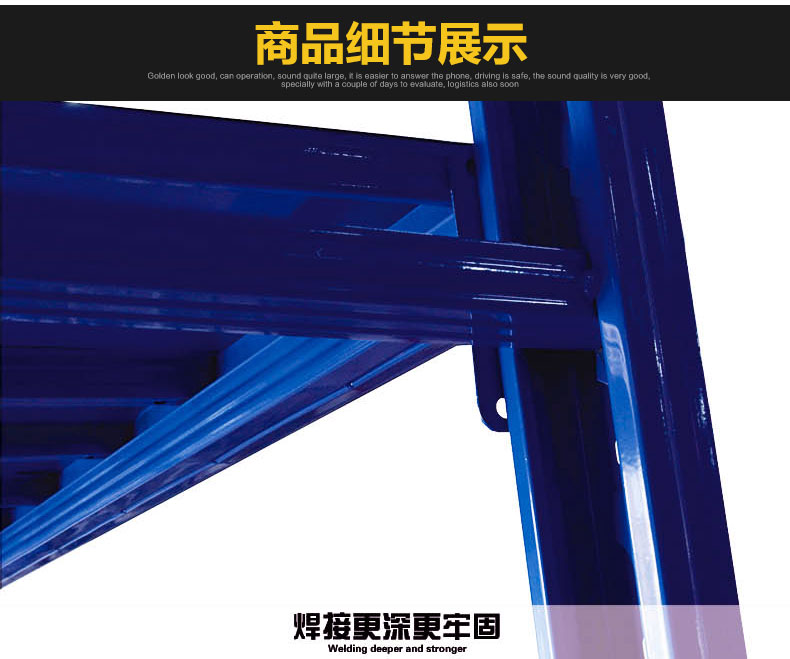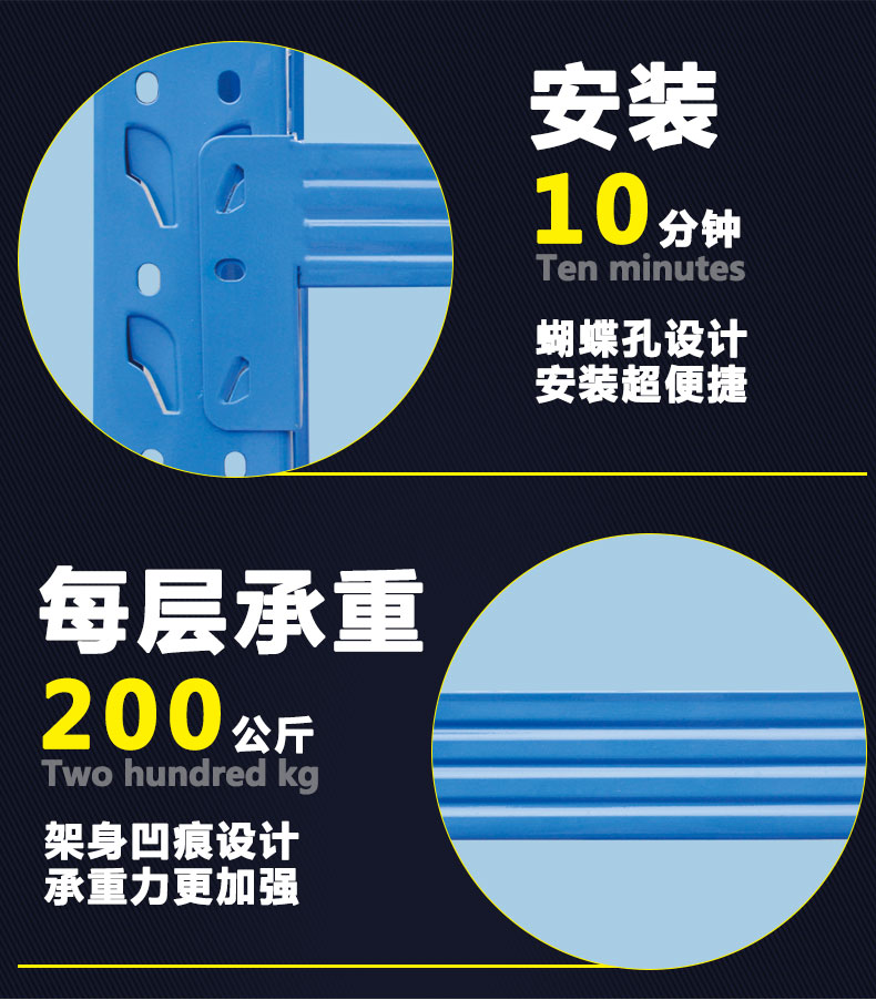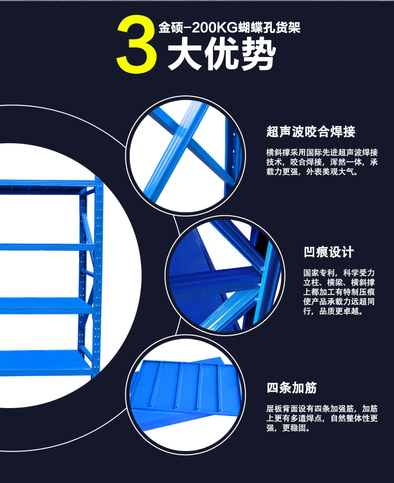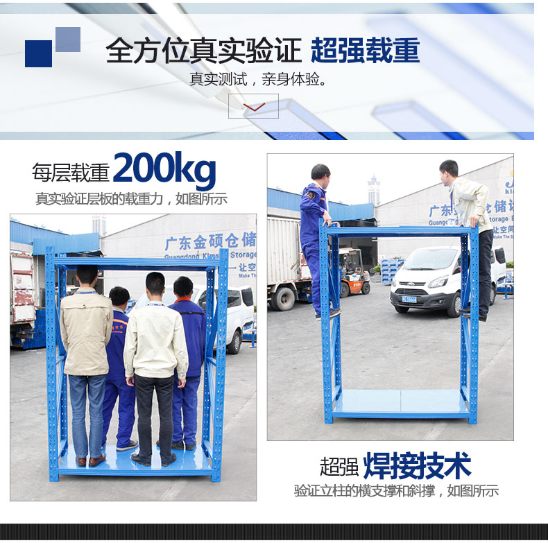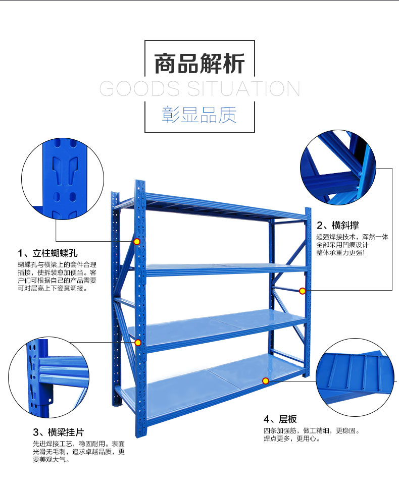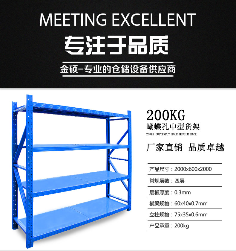 ![]() < > | 200KG 蝴蝶孔中型貨架型號(hào):200KG 蝴蝶孔中型貨架 規(guī)格:長(zhǎng)200cmx寬60cmx高200cm 貨架層數(shù):4層(可增加層數(shù)) 貨架承重:200KG/層 立柱厚度:75*35*0.68mm C型鋼 橫梁規(guī)格:60*40*0.55mm P型鋼 層板厚度:0.3mm冷軋鋼板 訂購(gòu)熱線:189-2509-6199 |