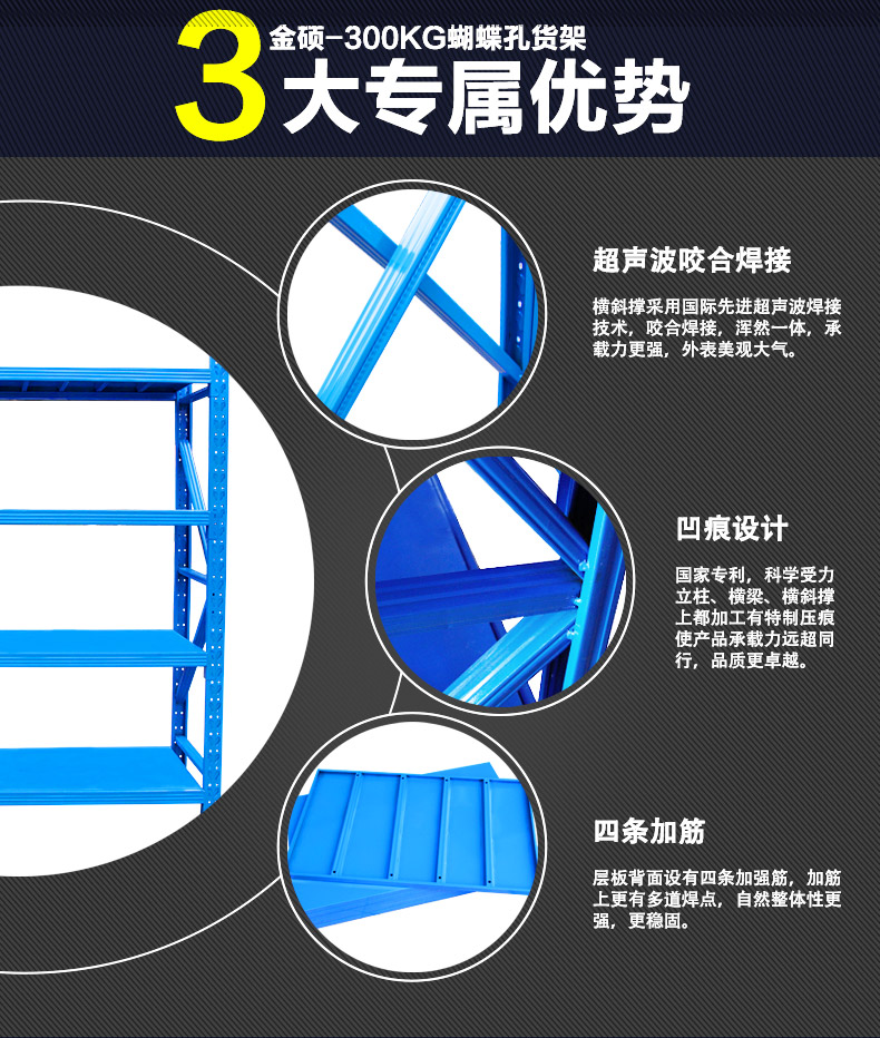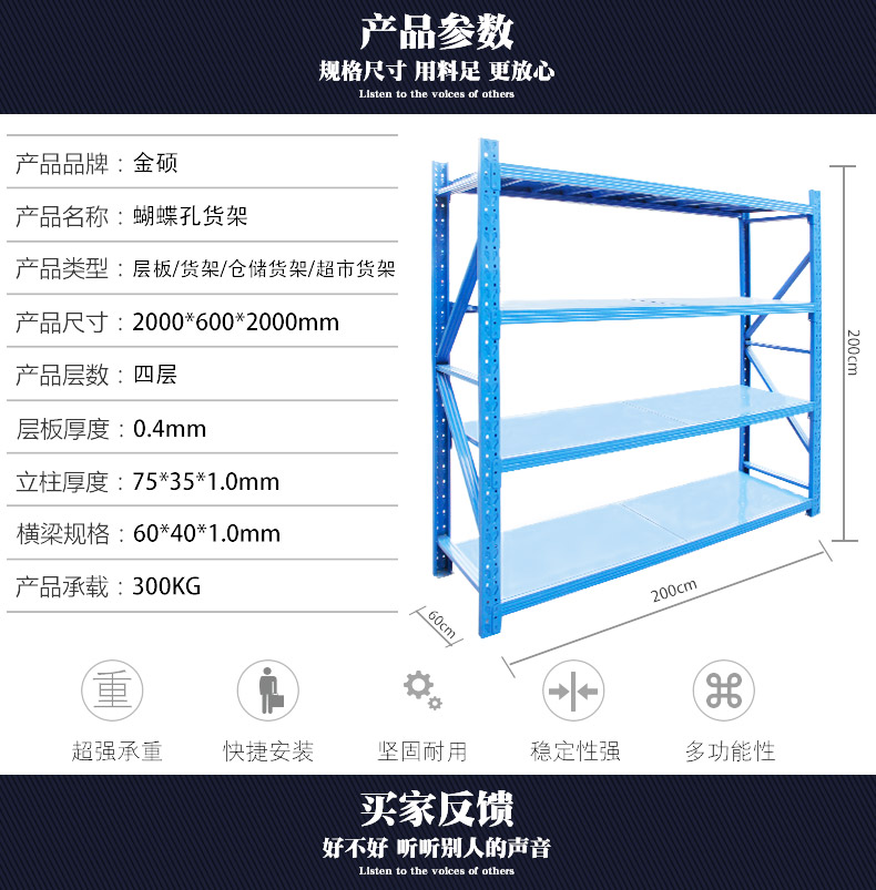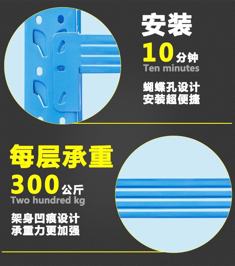 ![]() < > | 300KG 蝴蝶孔中型貨架型號:中型貨架04 規(guī)格:長200cmx寬60cmx高200cm 貨架層數(shù):4層(可增加層數(shù)) 貨架承重:300KG/層 立柱厚度:75*35*0.68mm C型鋼 橫梁規(guī)格:60*40*0.55mm P型鋼 層板厚度:0.3mm冷軋鋼板 訂購熱線:189-2509-6199 |
